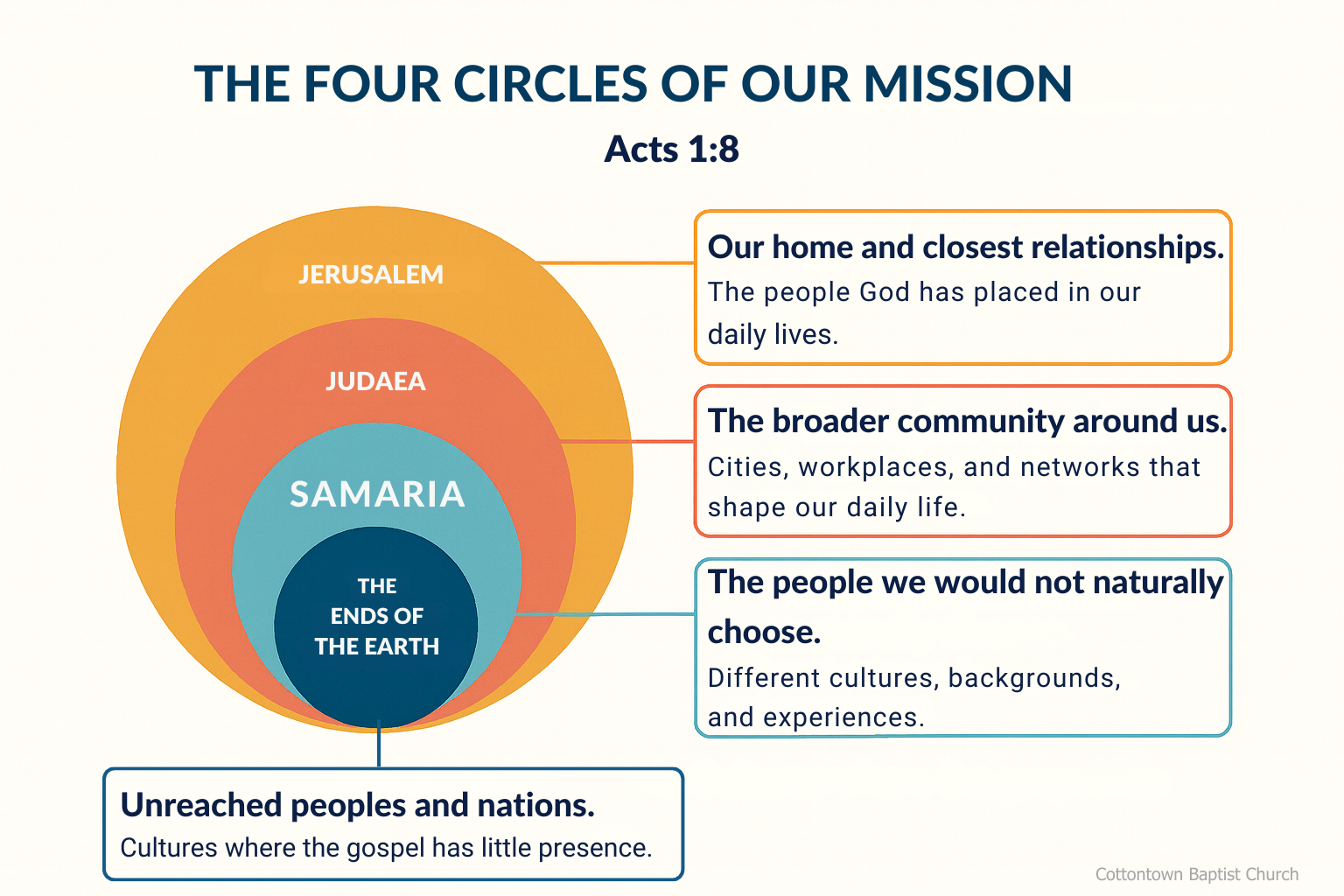 • Missions begins in our daily lives and expands wherever God opens the door for the gospel.